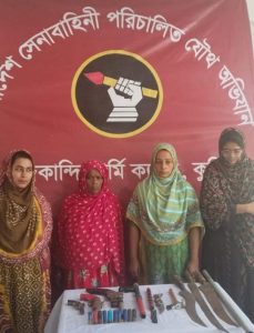 এরপর তারা সেনাবাহিনীকে খবর দিলে তারা দেড় ঘন্টা পর এসে আমার তিন ঝা ও অপর একজনকে আটক করে থানায় নিয়ে যায়। মহিলারা অস্ত্র দিয়ে কি করবে? আমাদের ঘরে কোন পুরুষ মানুষ নেই, সবাই প্রবাসি। মহিলা পেয়ে তারা আমাদেরকে ফাঁসিয়েছে।